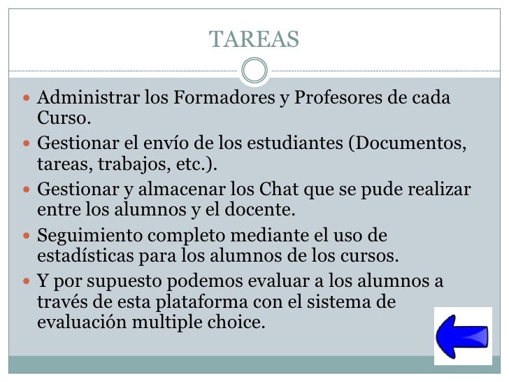 - 10. TAREAS Administrar los Formadores y Profesores de cada Curso. Gestionar el envío de los estudiantes (Documentos, tareas, trabajos, etc.). Gestionar y almacenar los Chat que se pude realizar entre los alumnos y el docente. Seguimiento completo mediante el uso de estadísticas para los alumnos de los cursos. Y por supuesto podemos evaluar a los alumnos a través de esta plataforma con el sistema de evaluación multiple choice.