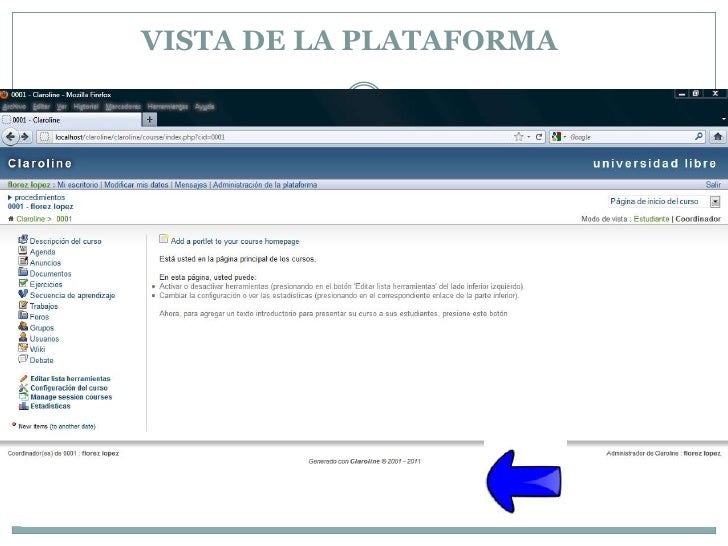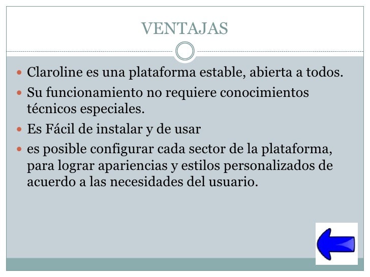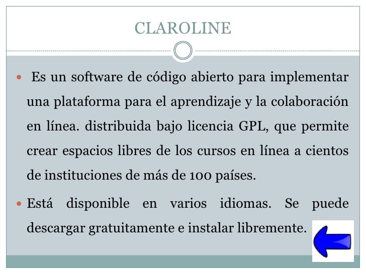 - 3. CLAROLINE Es un software de código abierto para implementar una plataforma para el aprendizaje y la colaboración en línea. distribuida bajo licencia GPL, que permite crear espacios libres de los cursos en línea a cientos de instituciones de más de 100 países. Está disponible en varios idiomas. Se puede descargar gratuitamente e instalar libremente.