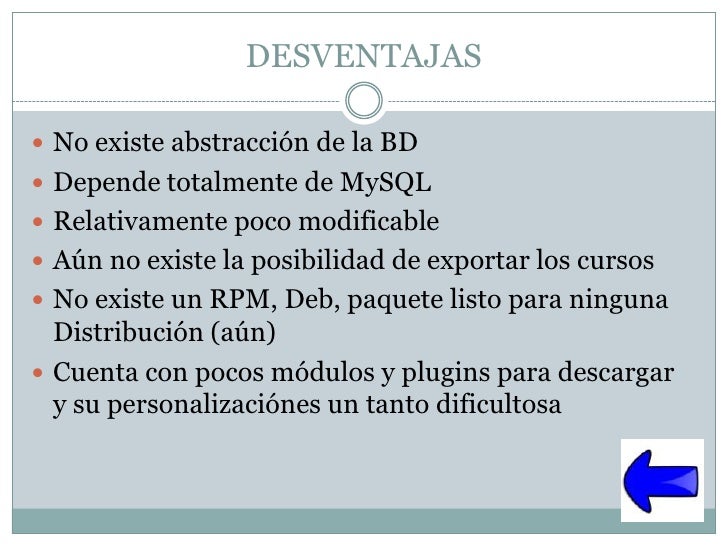 - 12. DESVENTAJAS No existe abstracción de la BD Depende totalmente de MySQL Relativamente poco modificable Aún no existe la posibilidad de exportar los cursos No existe un RPM, Deb, paquete listo para ninguna Distribución (aún) Cuenta con pocos módulos y plugins para descargar y su personalizaciónes un tanto dificultosa