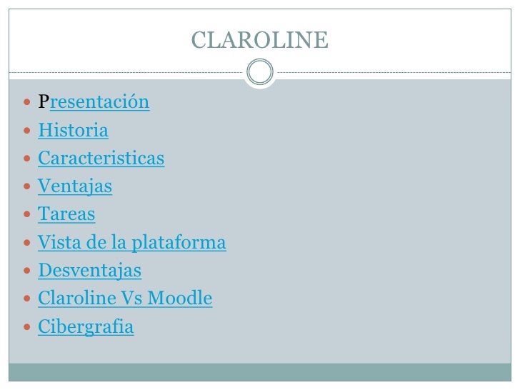 - 2. CLAROLINE Presentación Historia Caracteristicas Ventajas Tareas Vista de la plataforma Desventajas Claroline Vs Moodle Cibergrafia