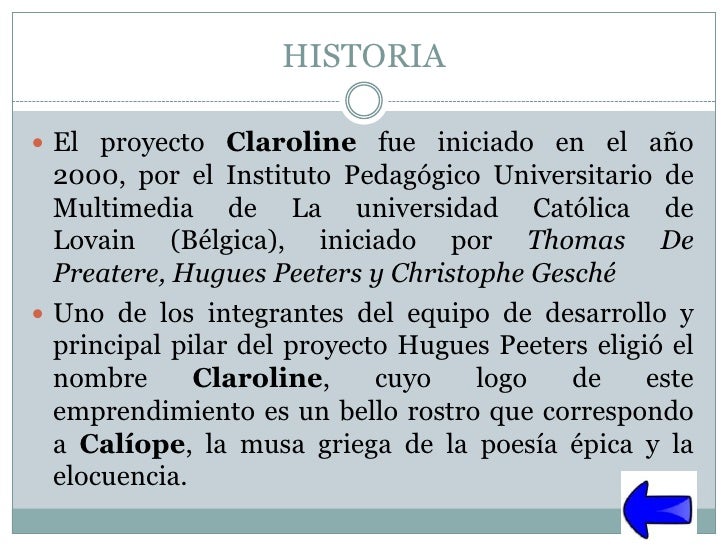 - 4. HISTORIA El proyecto Claroline fue iniciado en el año 2000, por el Instituto Pedagógico Universitario de Multimedia de La universidad Católica de Lovain (Bélgica), iniciado por Thomas De Preatere, Hugues Peeters y Christophe Gesché Uno de los integrantes del equipo de desarrollo y principal pilar del proyecto Hugues Peeters eligió el nombre Claroline, cuyo logo de este emprendimiento es un bello rostro que correspondo a Calíope, la musa griega de la poesía épica y la elocuencia.