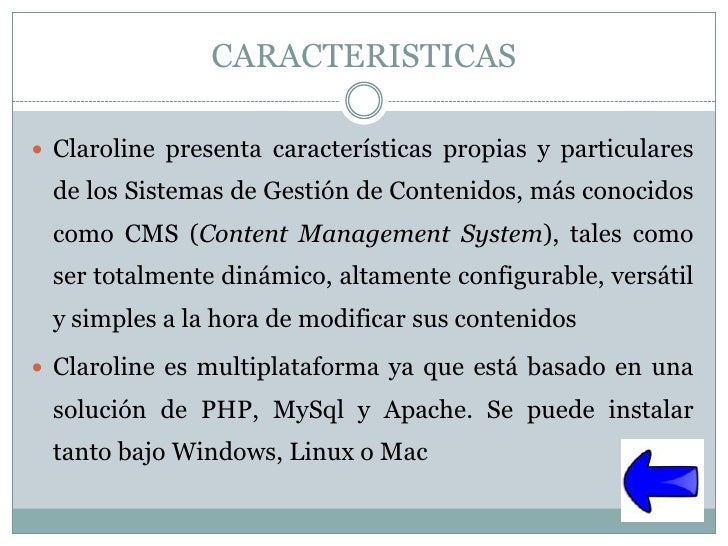 - 6. CARACTERISTICAS Claroline presenta características propias y particulares de los Sistemas de Gestión de Contenidos, más conocidos como CMS (Content Management System), tales como ser totalmente dinámico, altamente configurable, versátil y simples a la hora de modificar sus contenidos Claroline es multiplataforma ya que está basado en una solución de PHP, MySql y Apache. Se puede instalar tanto bajo Windows, Linux o Mac