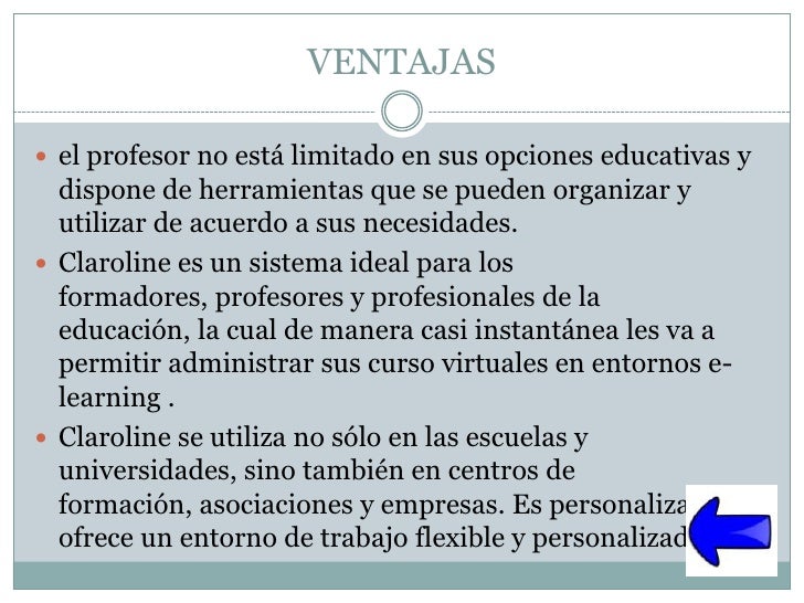 - 8. VENTAJAS el profesor no está limitado en sus opciones educativas y dispone de herramientas que se pueden organizar y utilizar de acuerdo a sus necesidades. Claroline es un sistema ideal para los formadores, profesores y profesionales de la educación, la cual de manera casi instantánea les va a permitir administrar sus curso virtuales en entornos e- learning . Claroline se utiliza no sólo en las escuelas y universidades, sino también en centros de formación, asociaciones y empresas. Es personalizable y ofrece un entorno de trabajo flexible y personalizado.