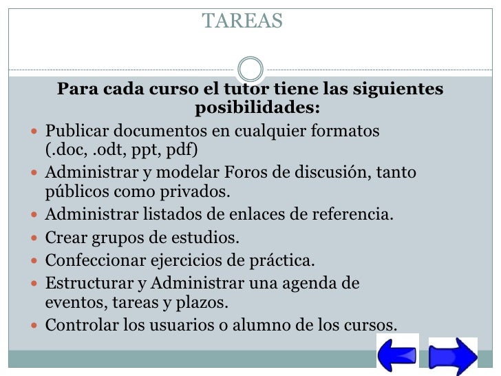- 9. TAREAS Para cada curso el tutor tiene las siguientes posibilidades: Publicar documentos en cualquier formatos (.doc, .odt, ppt, pdf) Administrar y modelar Foros de discusión, tanto públicos como privados. Administrar listados de enlaces de referencia. Crear grupos de estudios. Confeccionar ejercicios de práctica. Estructurar y Administrar una agenda de eventos, tareas y plazos. Controlar los usuarios o alumno de los cursos.